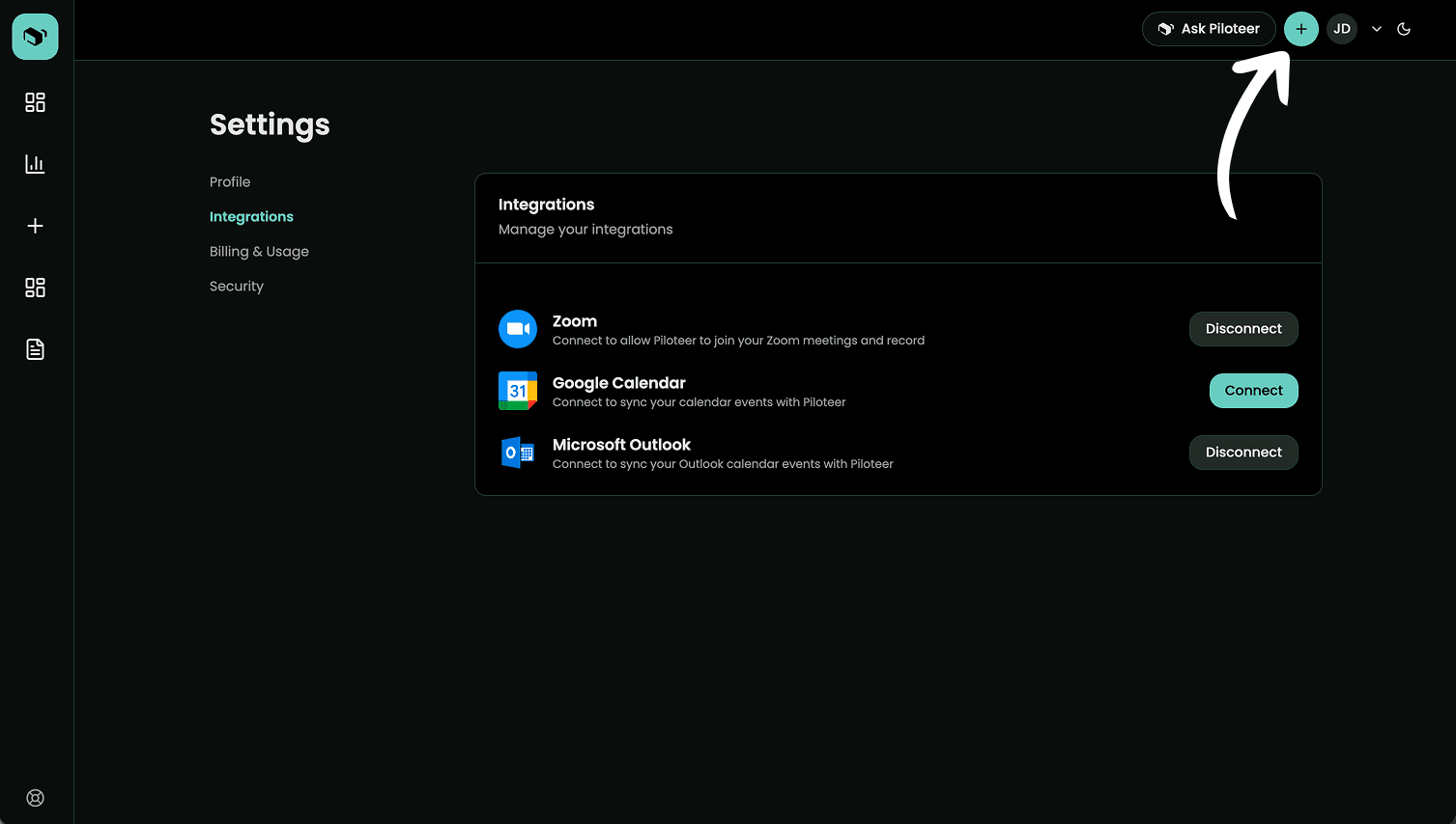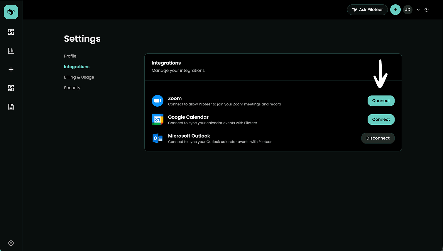 3. Click on Integrations tab on sidebar then click Connect for Zoom